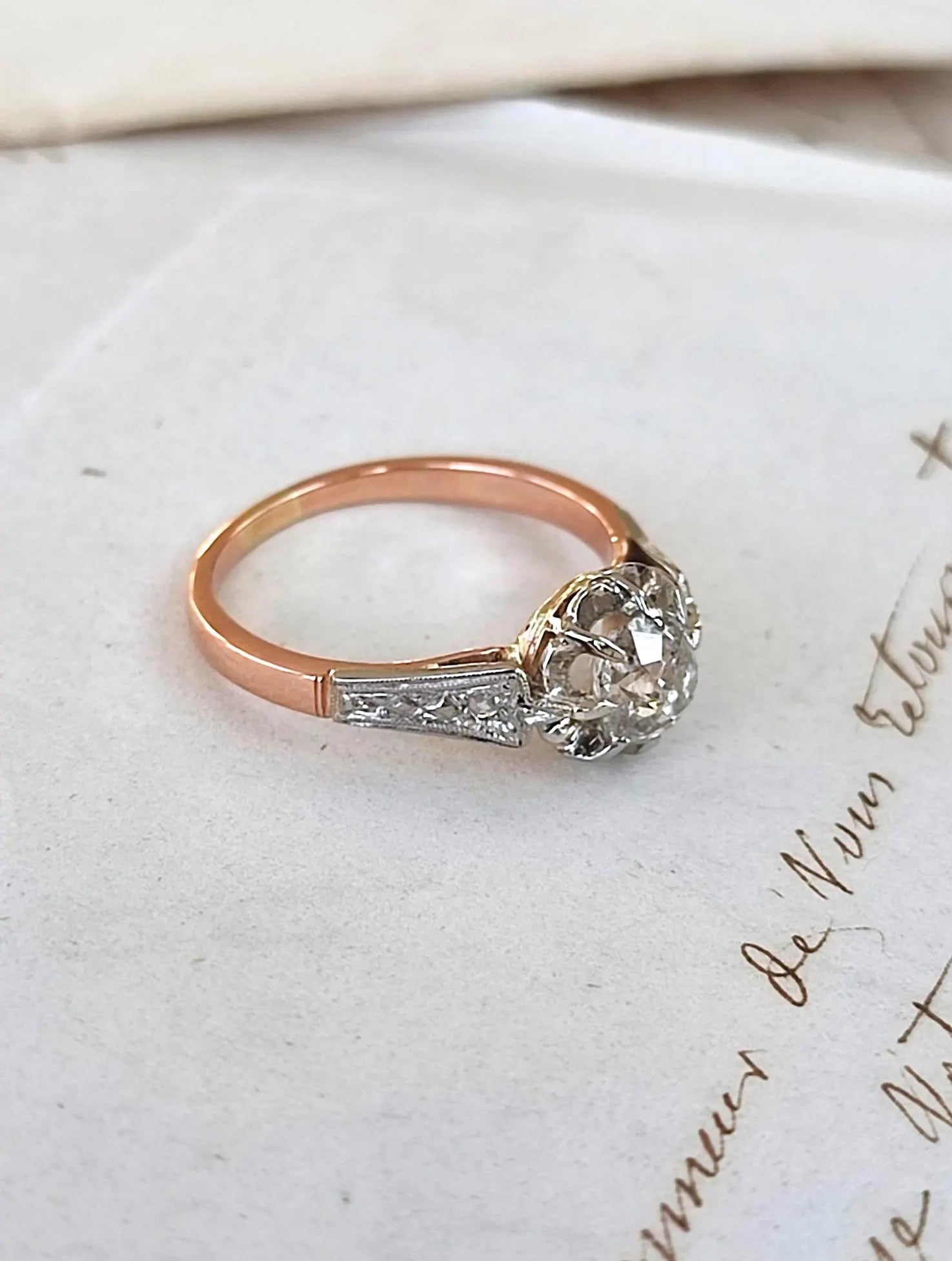 Bague ancienne diamant 0,70 ct en or rose et blanc 18k – solitaire illusion Art Déco