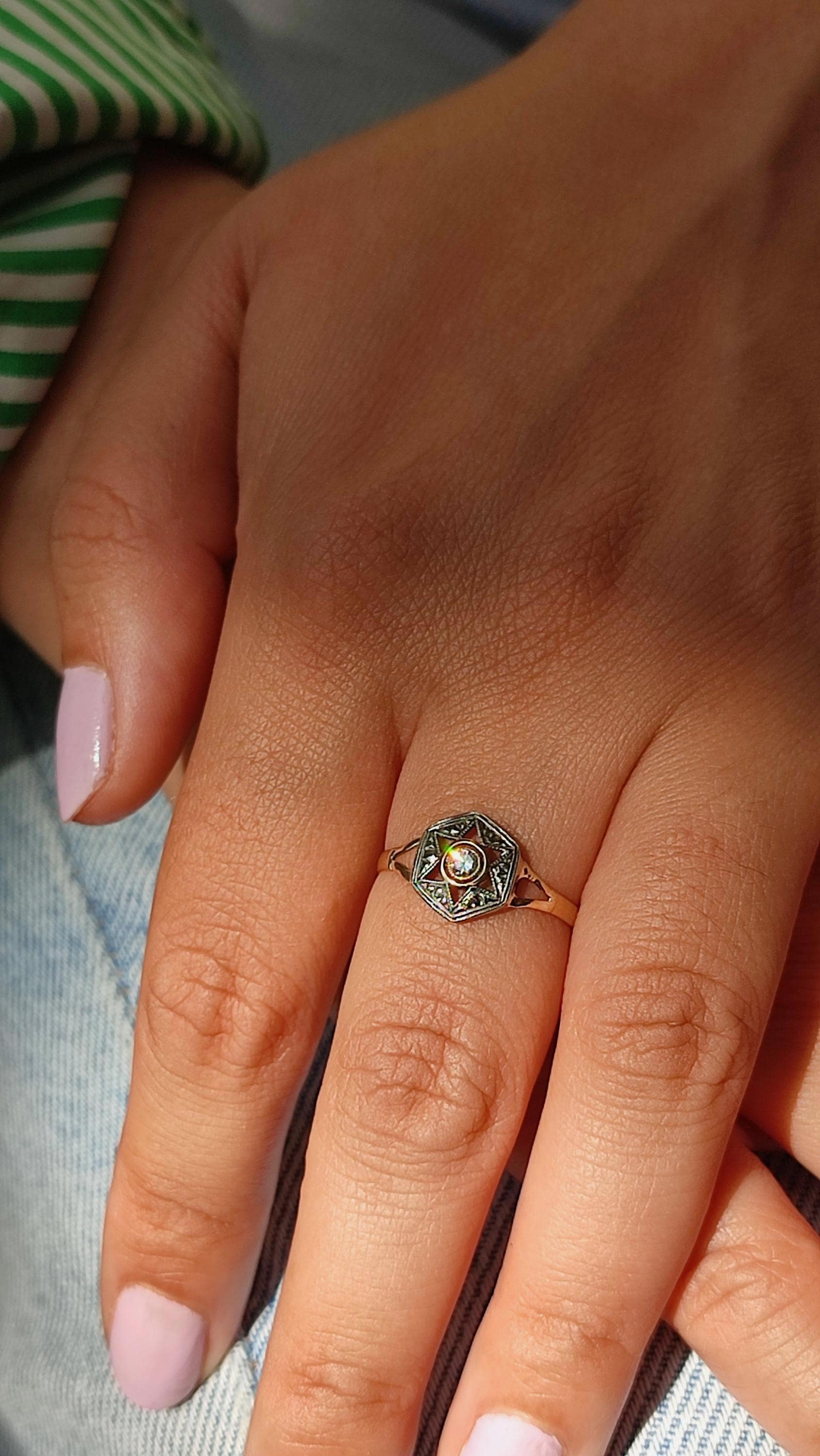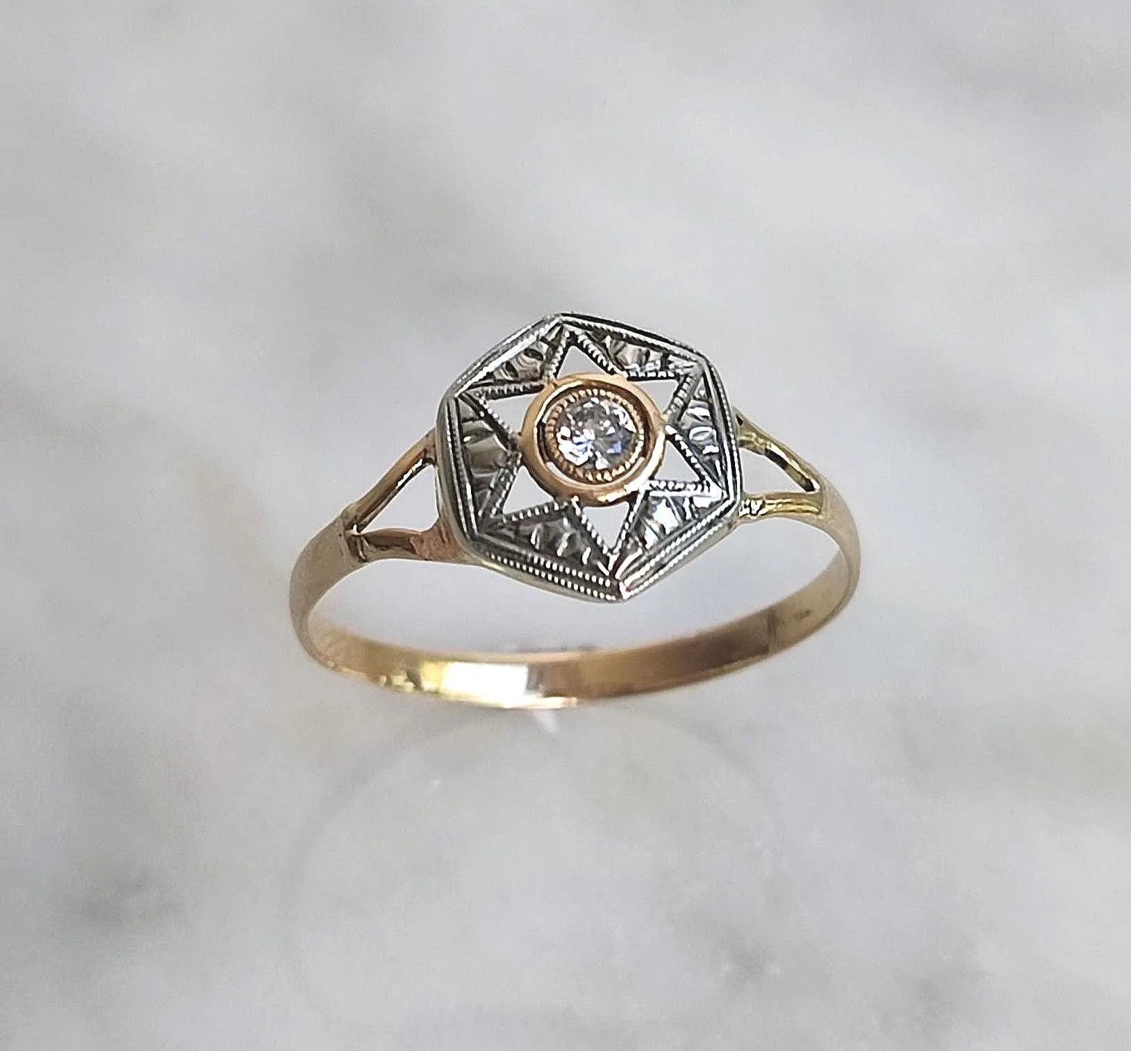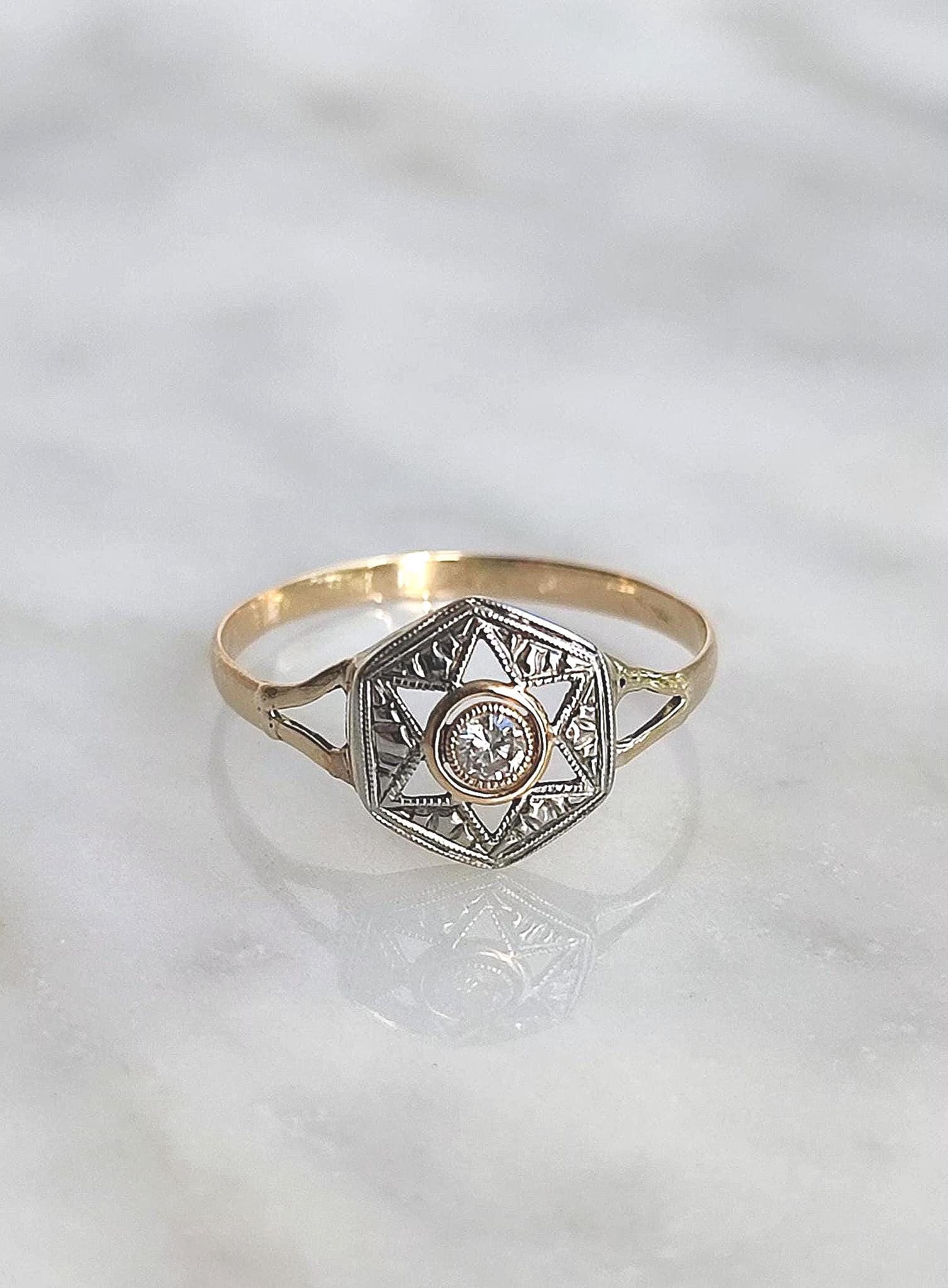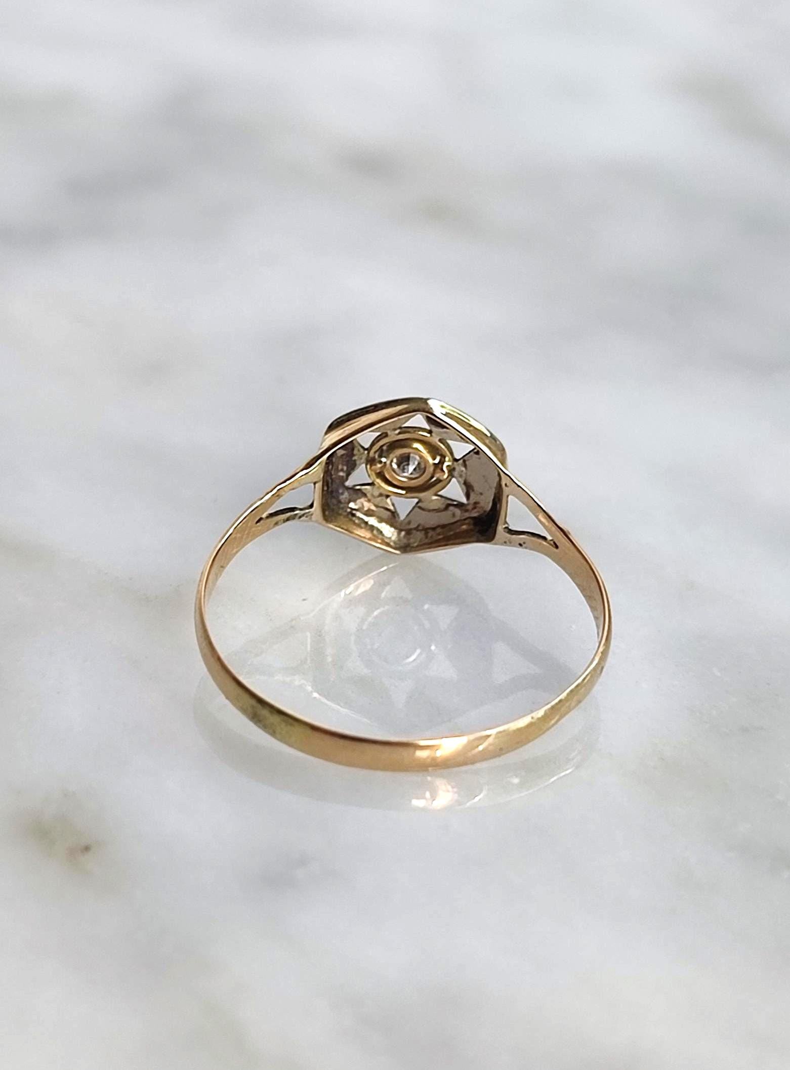 Bague ancienne étoile en or 18K jaune et gris, diamant naturel 0,11ct, bijou français XIXe siècle