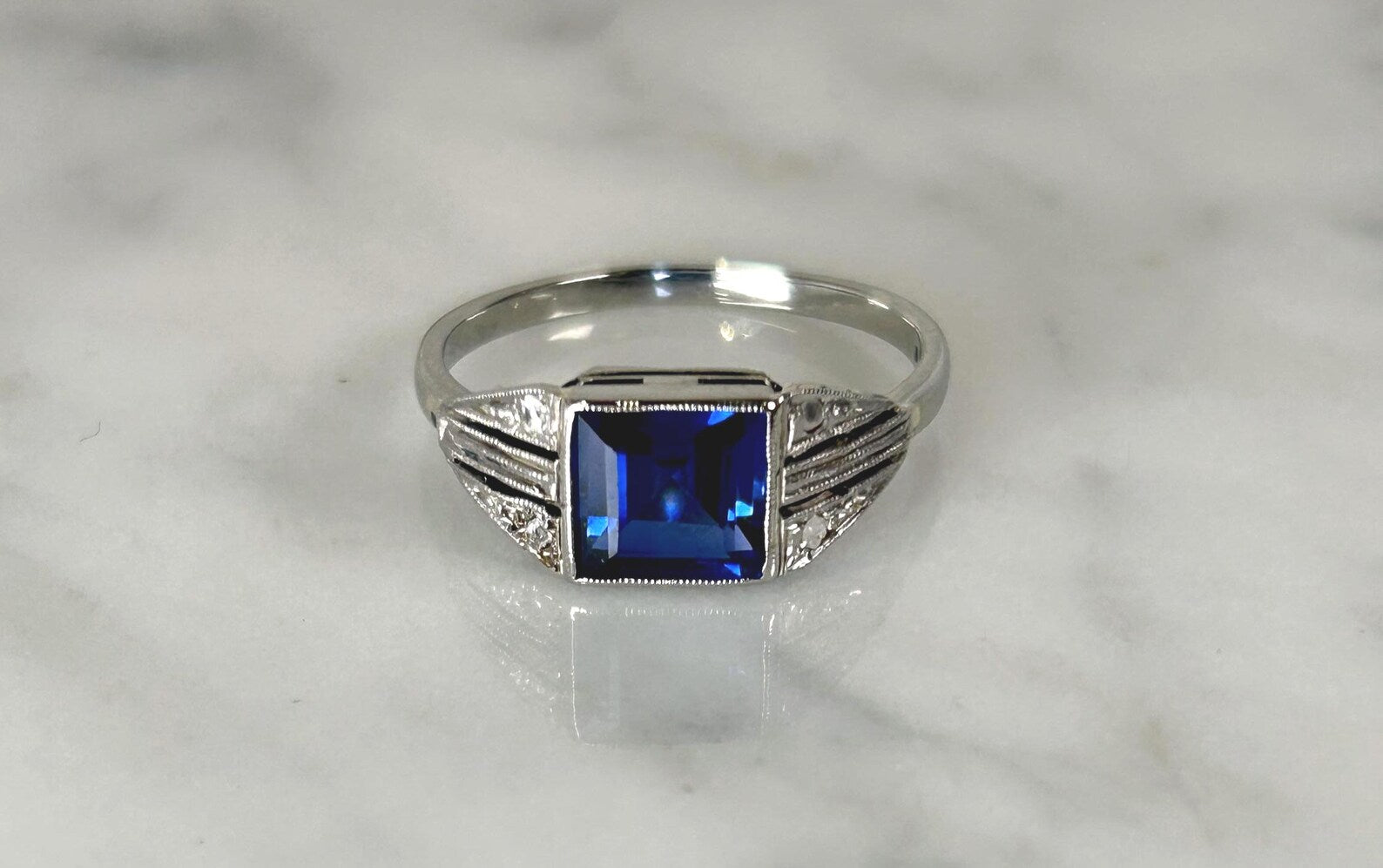 Bague ancienne en or blanc 18k (750 millièmes), ornée d’un saphir de synthèse bleu facetté, épaulé de petits diamants taillés en rose.