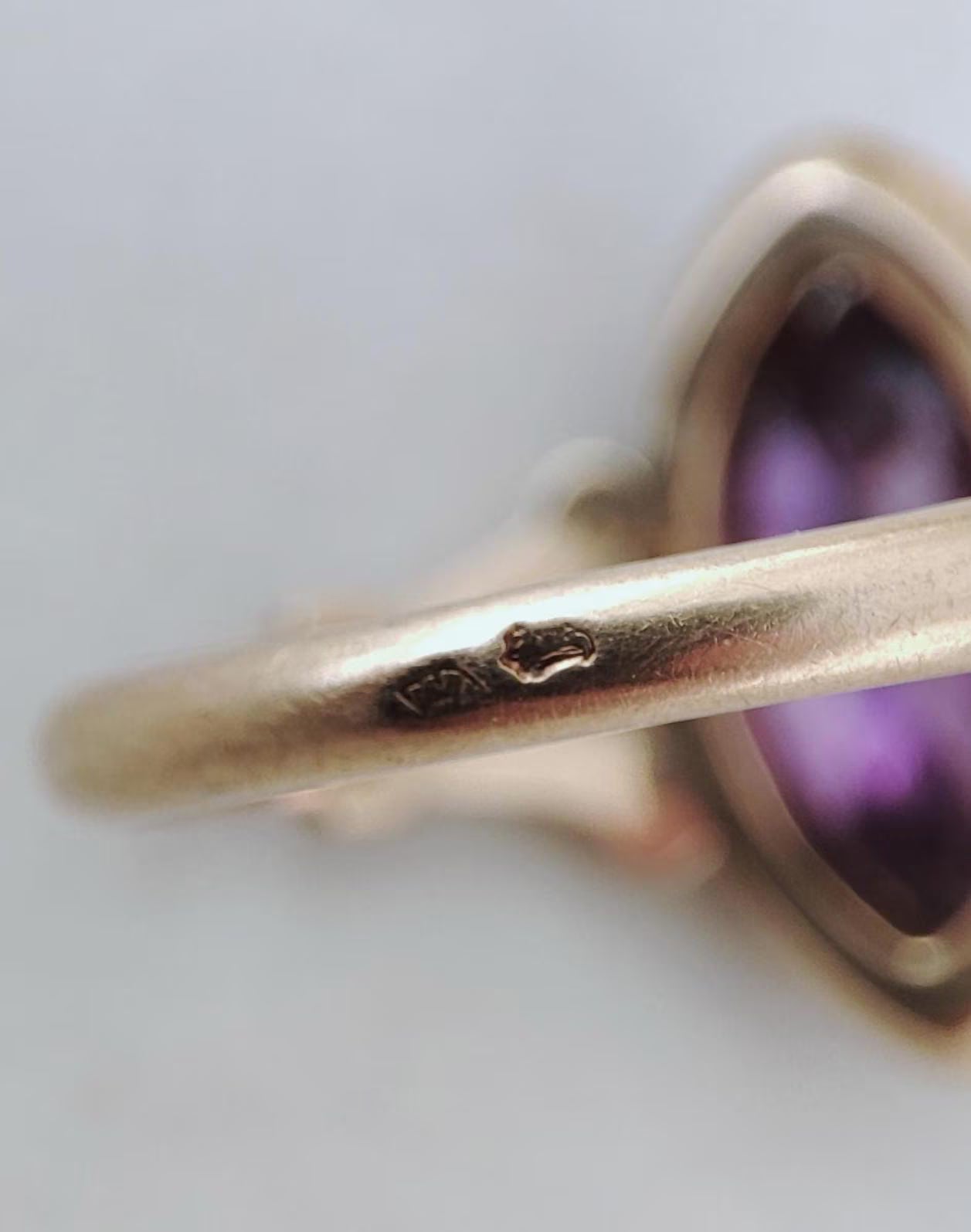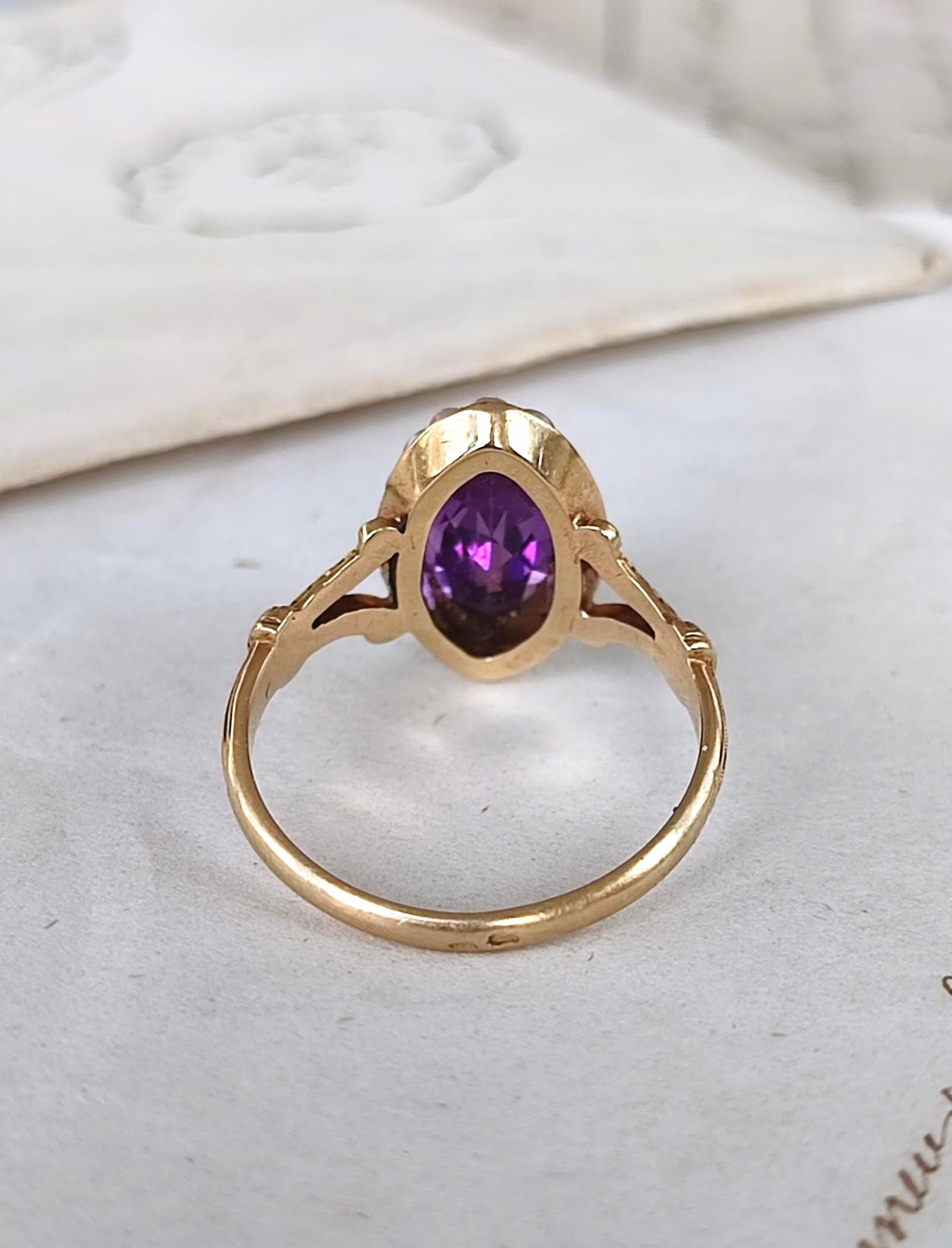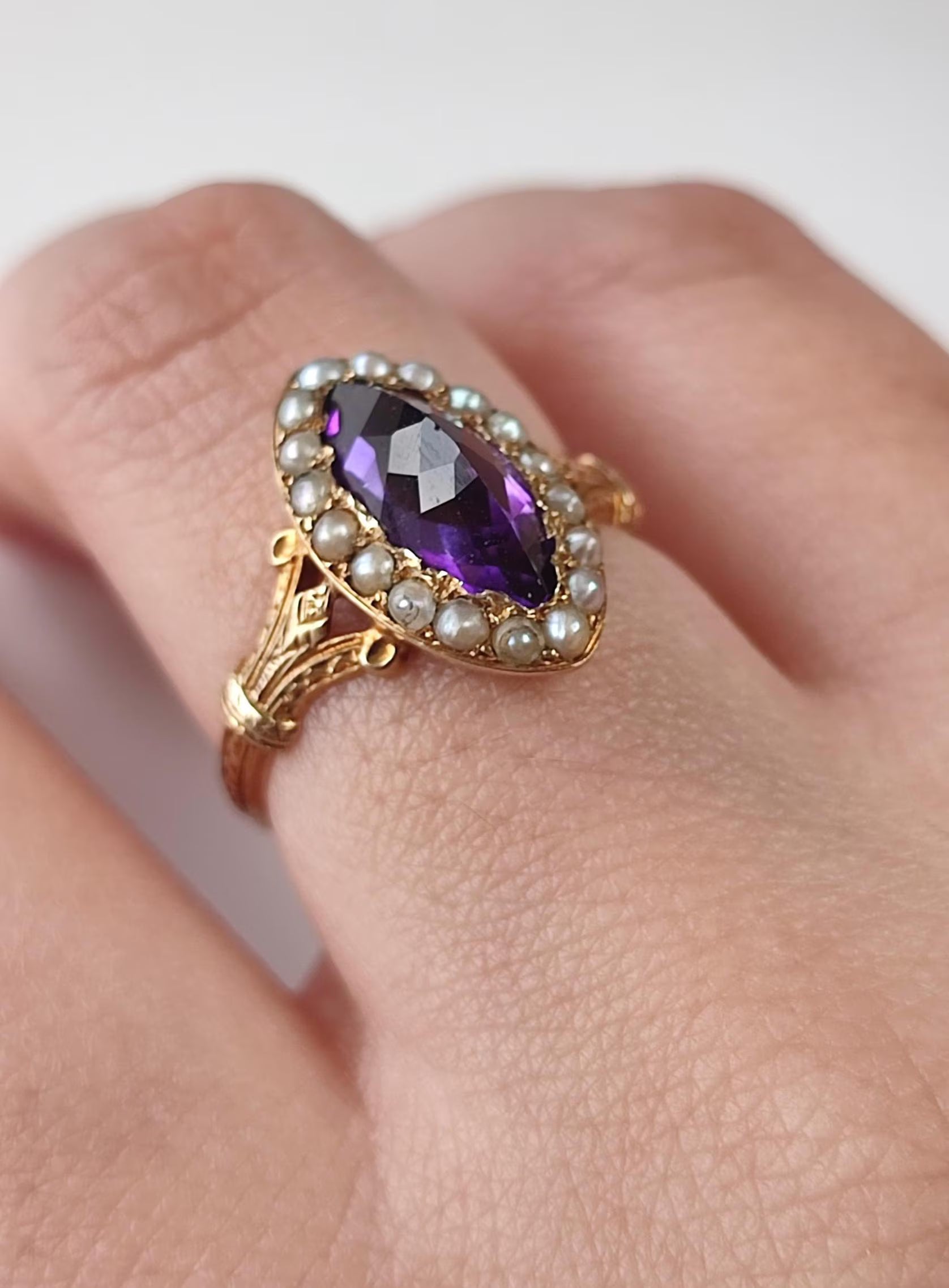 Bague marquise en or jaune 18k, XIXe siècle, centrée d'une améthyste sertie clos dans un entourage de perles naturelles, probablement fines. Les épaules de la bague sont décorées de volutes et gravées, elles s’évasent en douceur dans un profil typique des bijoux sentimentaux de l'époque victorienne. L'améthyste d'origine était cassée et a été remplacée par notre joaillier maison.
