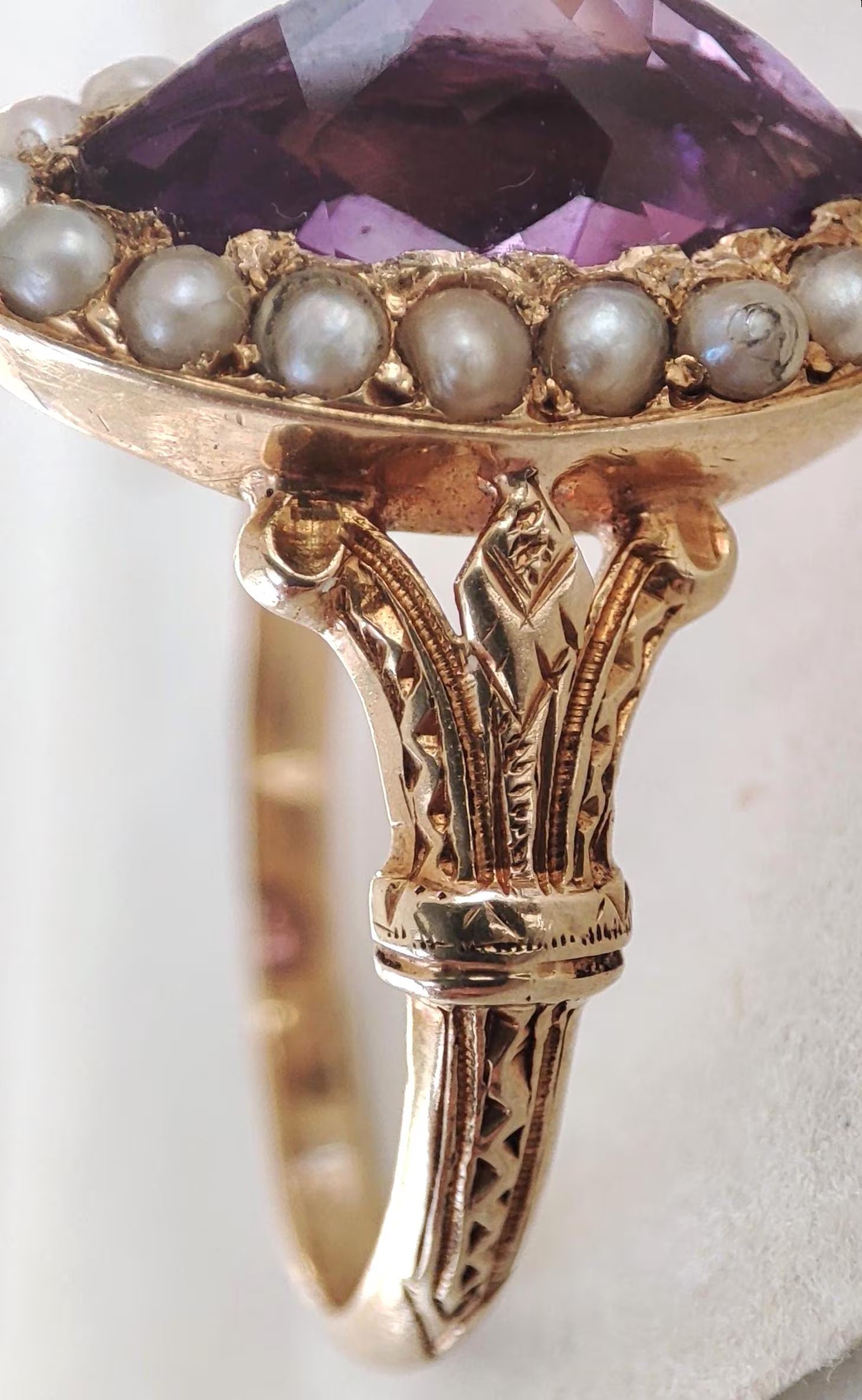 Bague victorienne en or jaune 18k et améthyste, entourage perles - 19e siècle - bague de sentiment ancienne