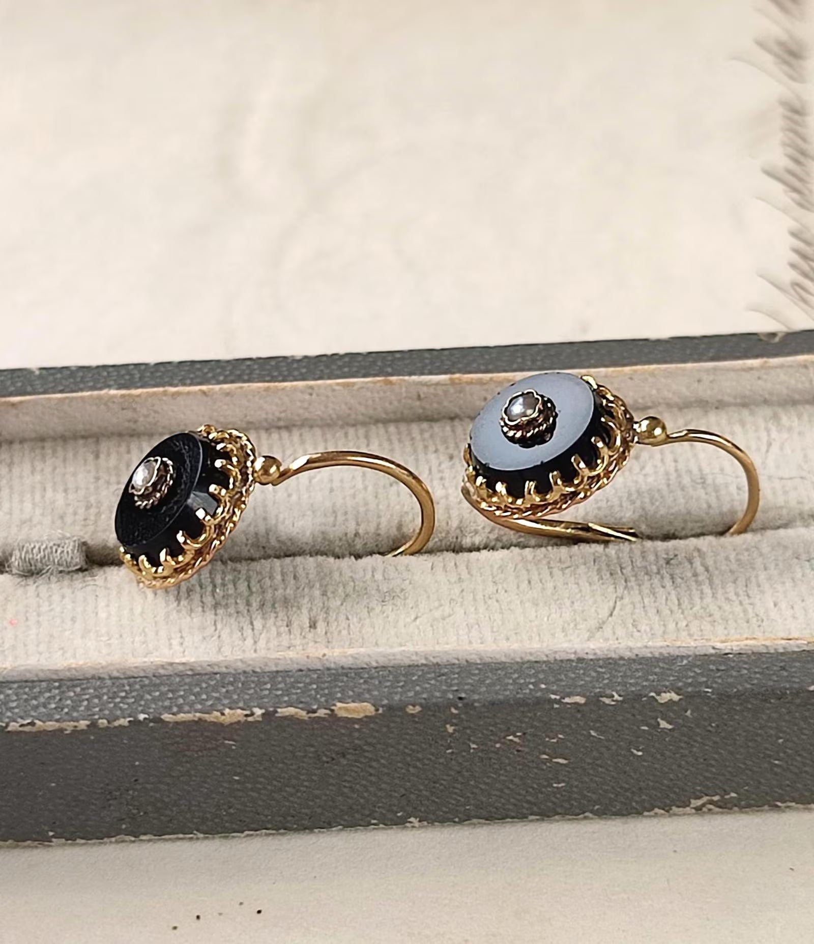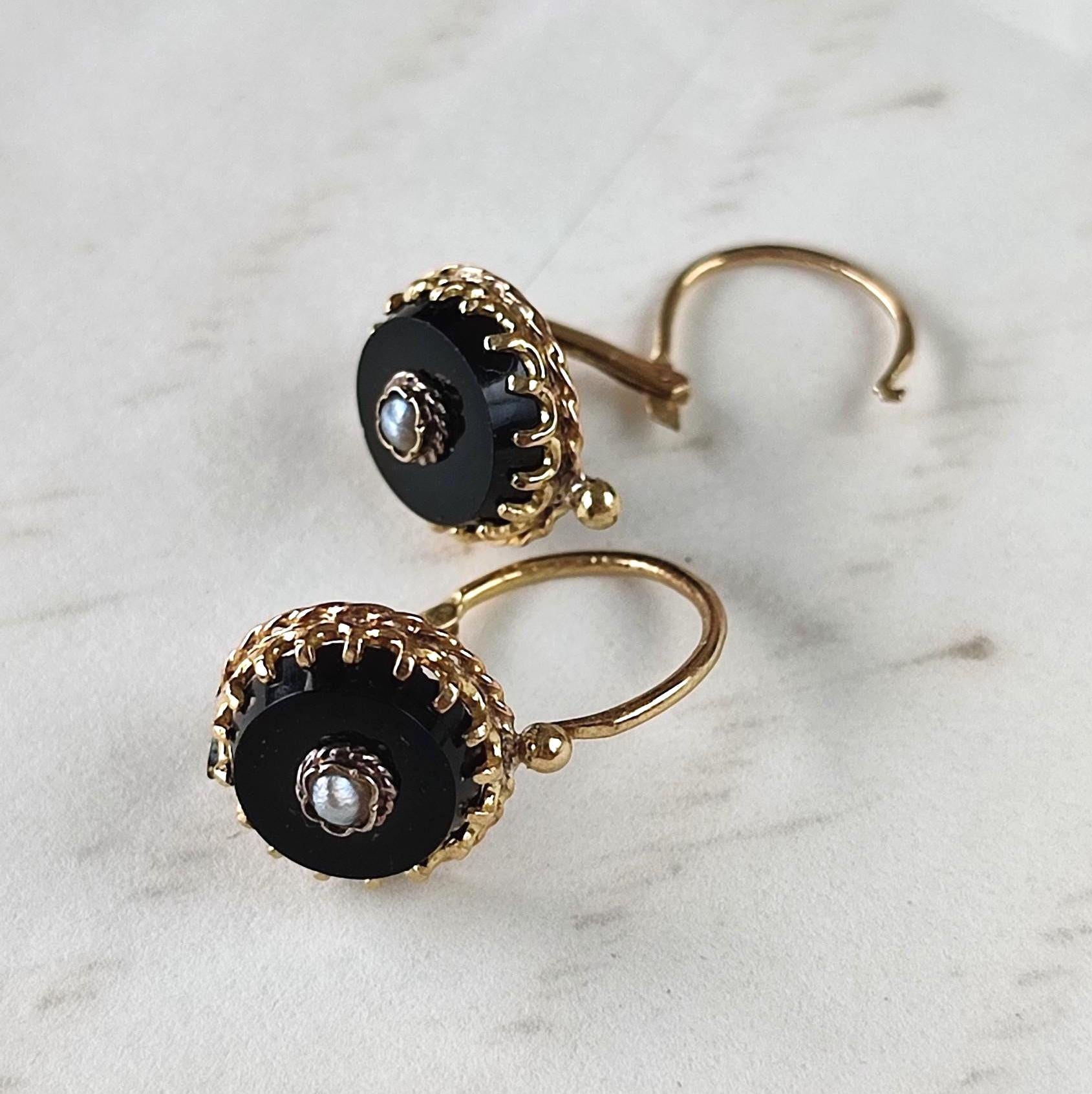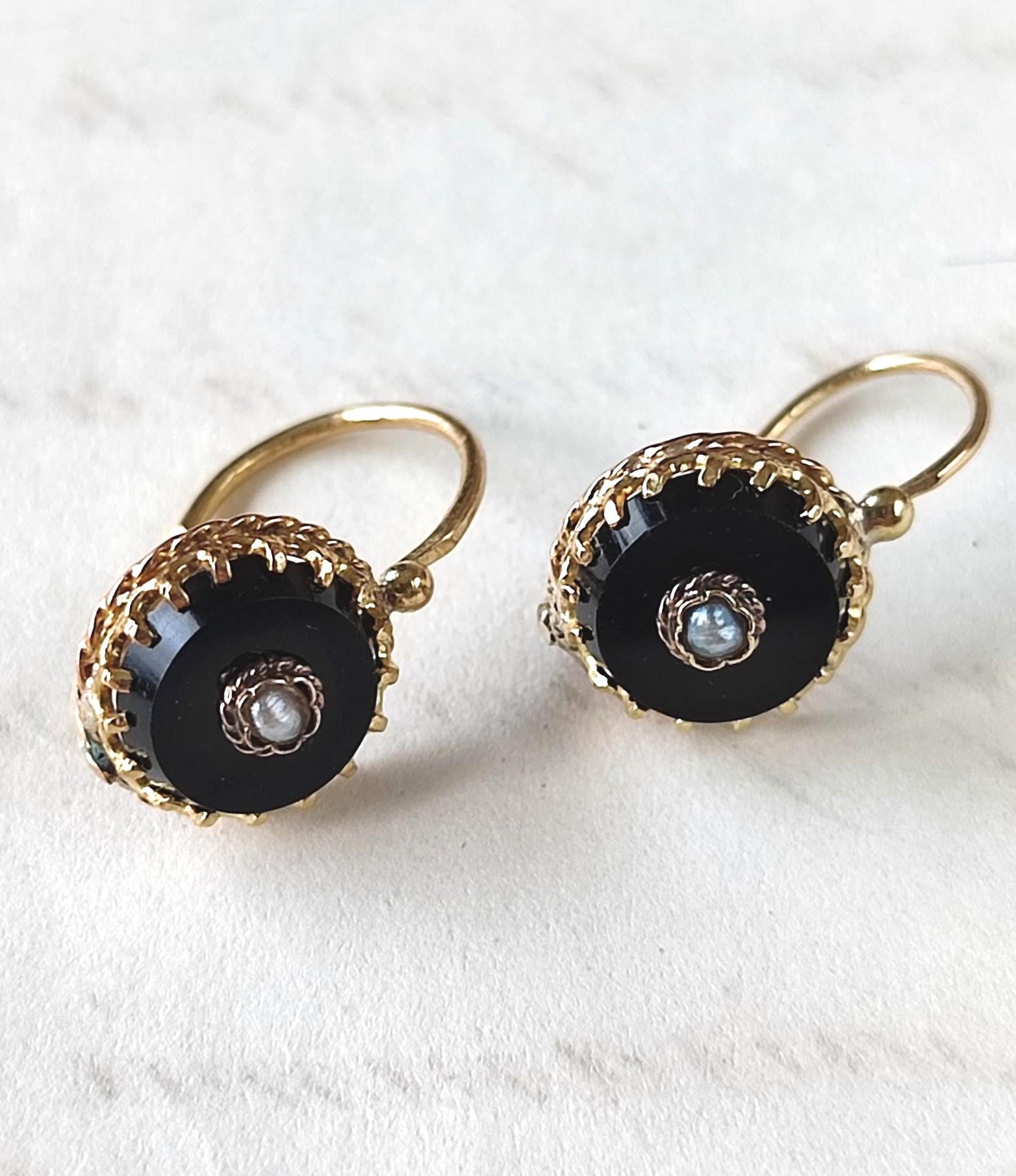 Boucles d’oreilles dormeuses anciennes or 18K onyx et perles fines, Napoléon III XIXe siècle