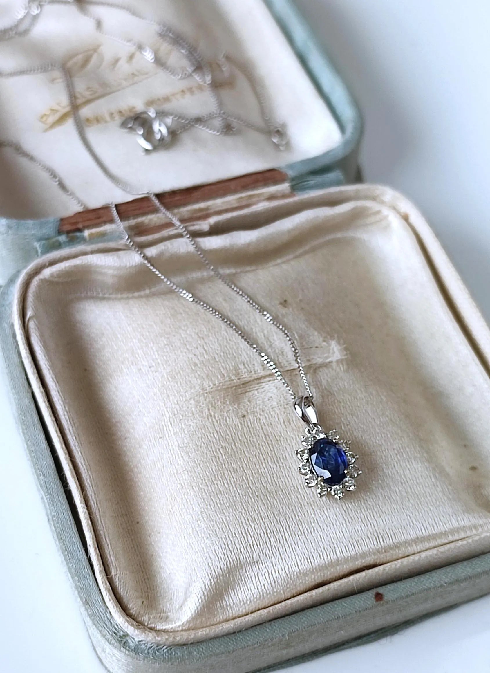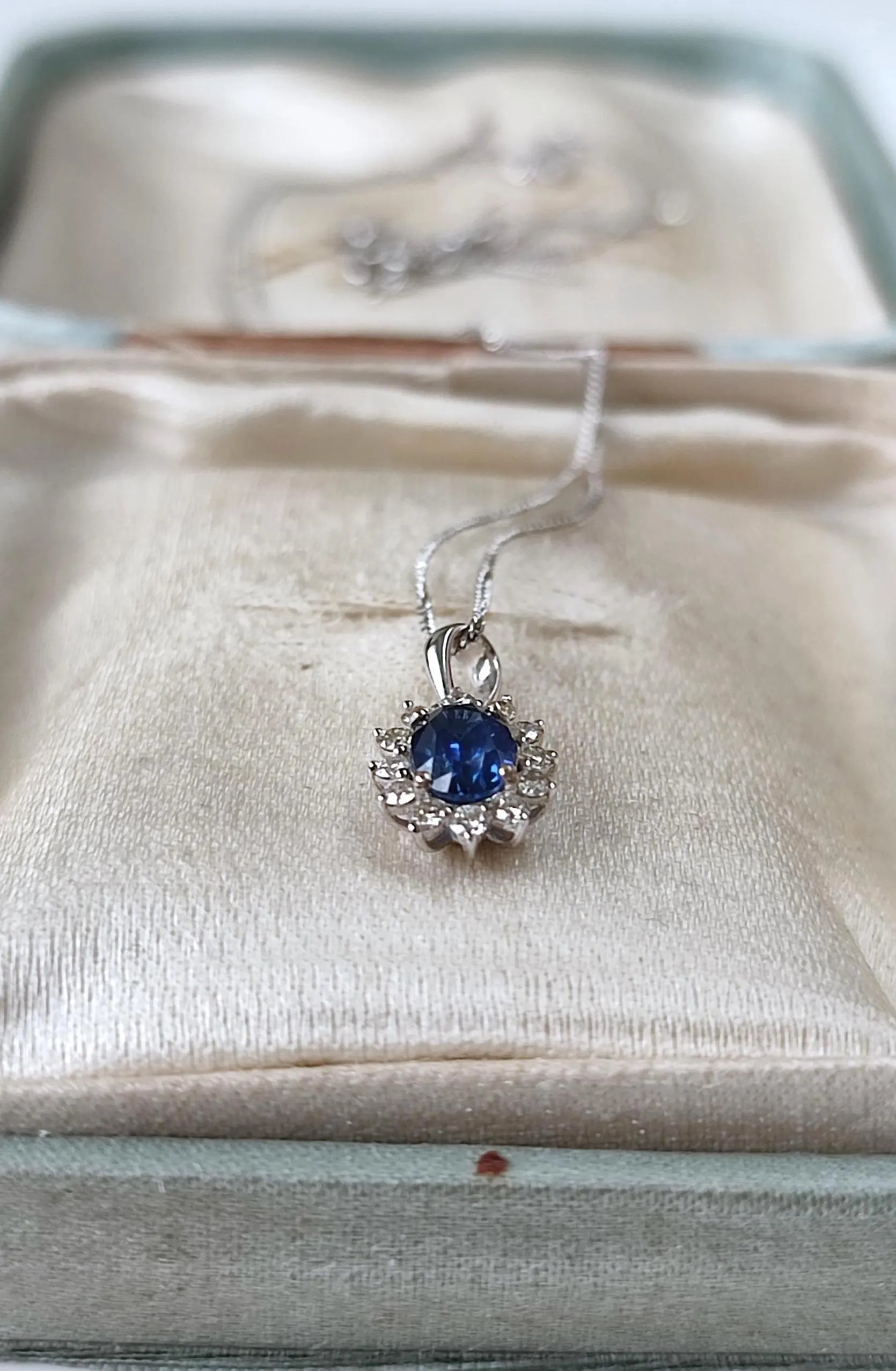Collier vintage en or blanc 18K avec saphir de Ceylan 0,40 ct & diamants – Chaîne 42 cm