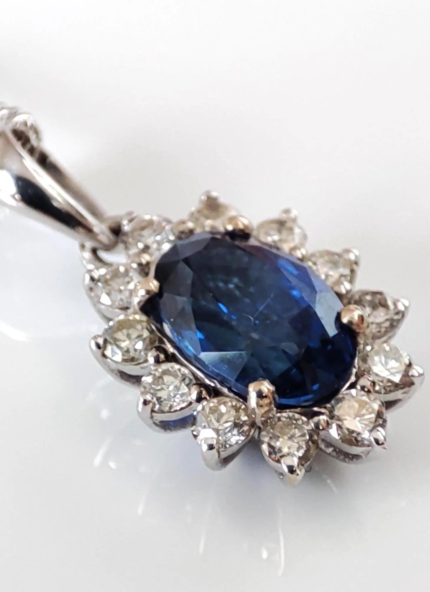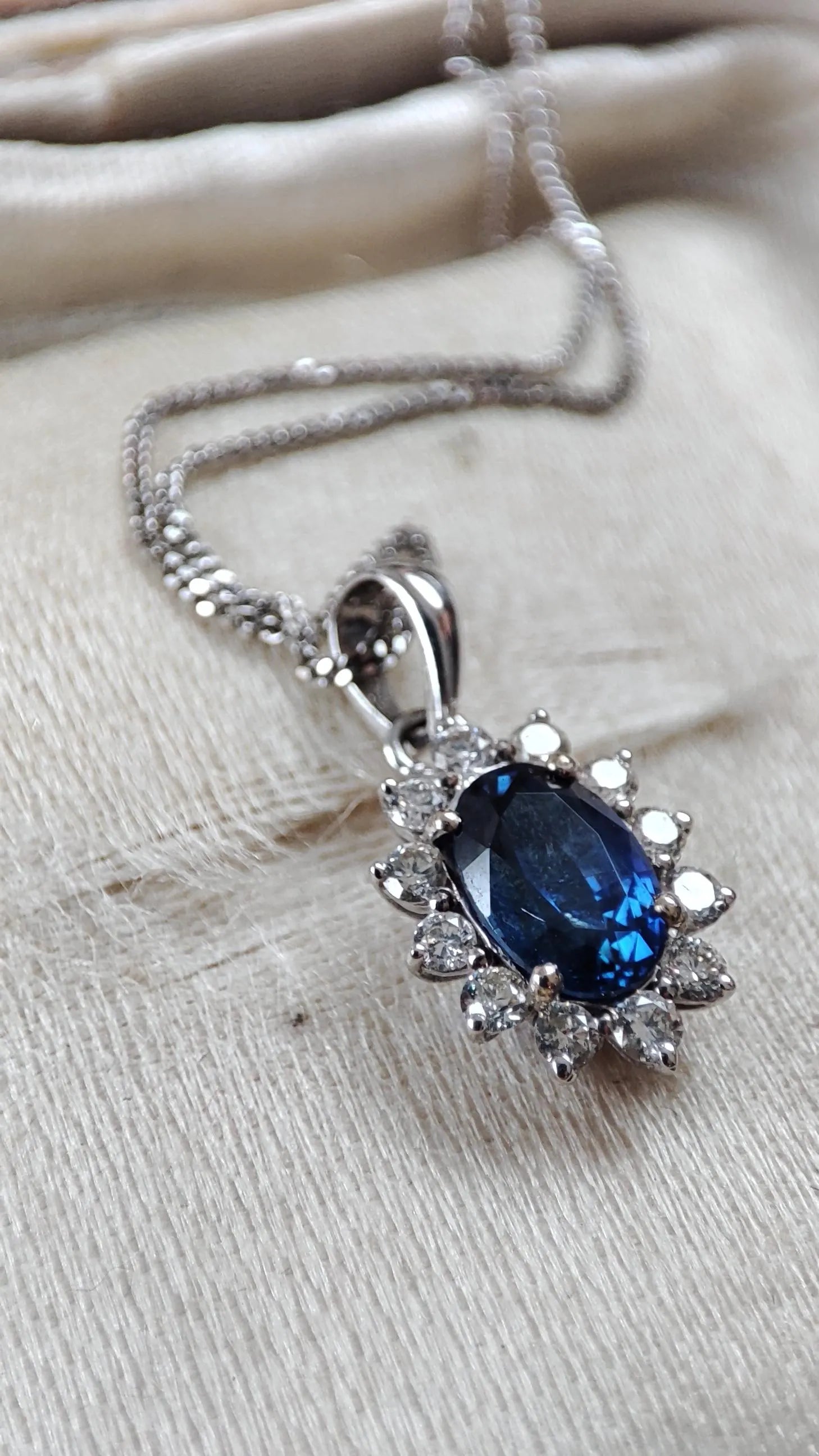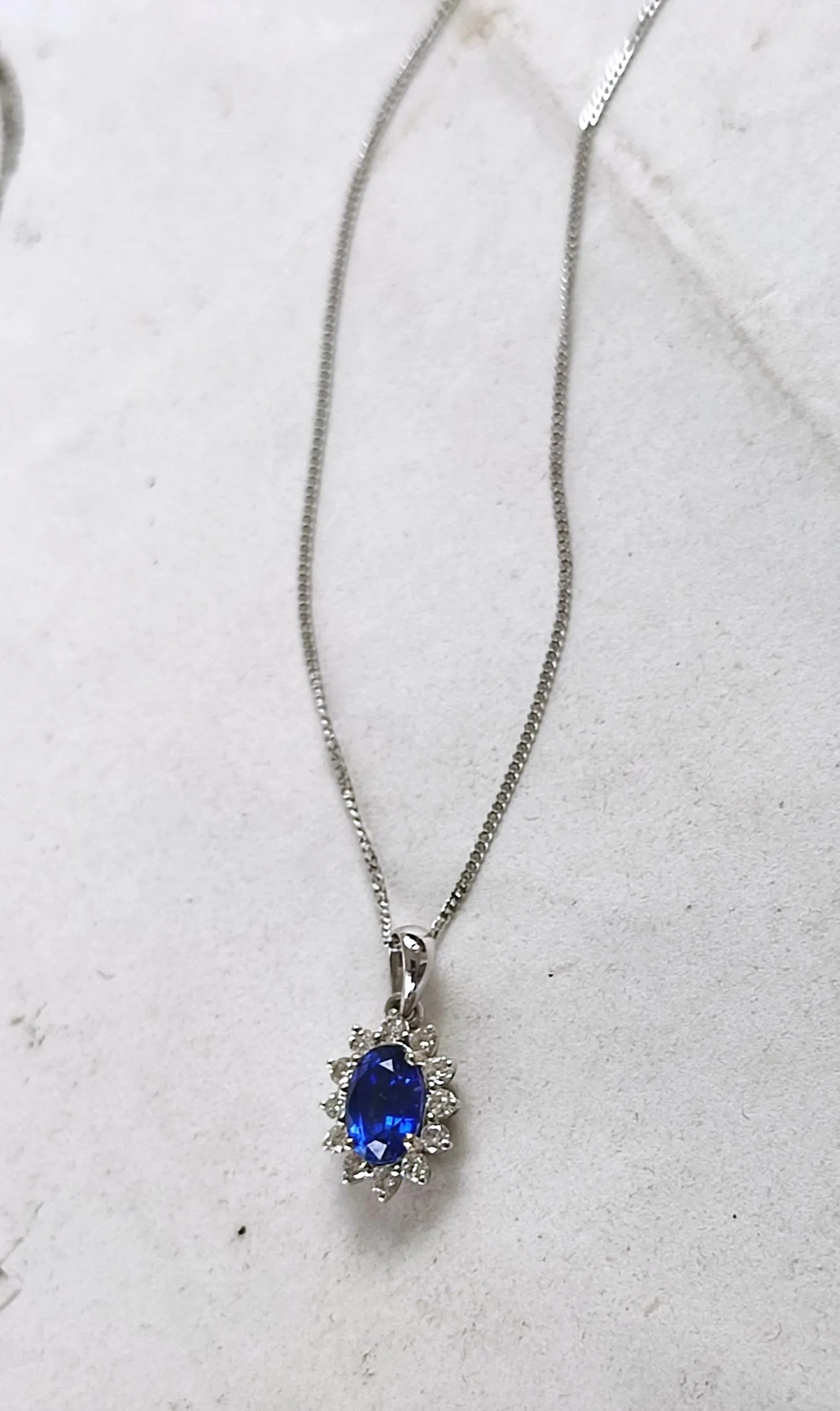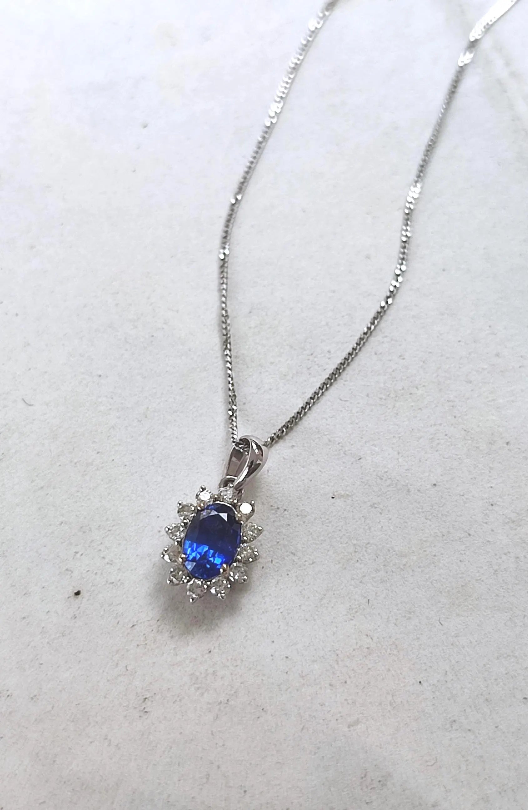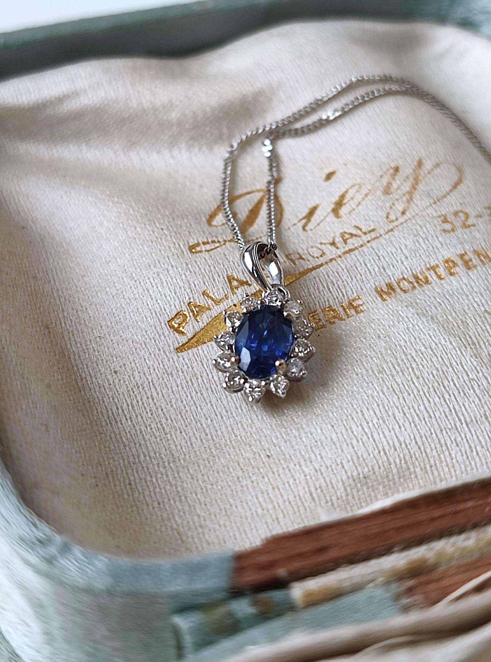 Ce collier vintage est composé d’un pendentif en or blanc 18k, orné d’un saphir ovale naturel d'un bleu profond sur une chaîne fine à maille gourmette. La pierre centrale est mise en valeur par un entourage de 12 diamants taille brillant, disposés en motif marguerite ou "Pompadour". La chaîne est également en or blanc.
