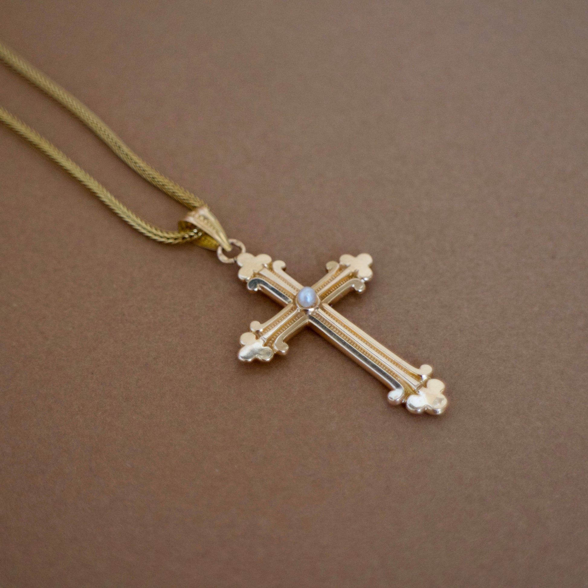 Croix ancienne en or 18 carats et perle – Pendentif style néogothique, fin 19e siècle