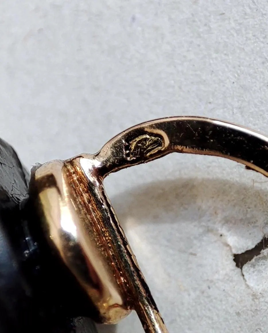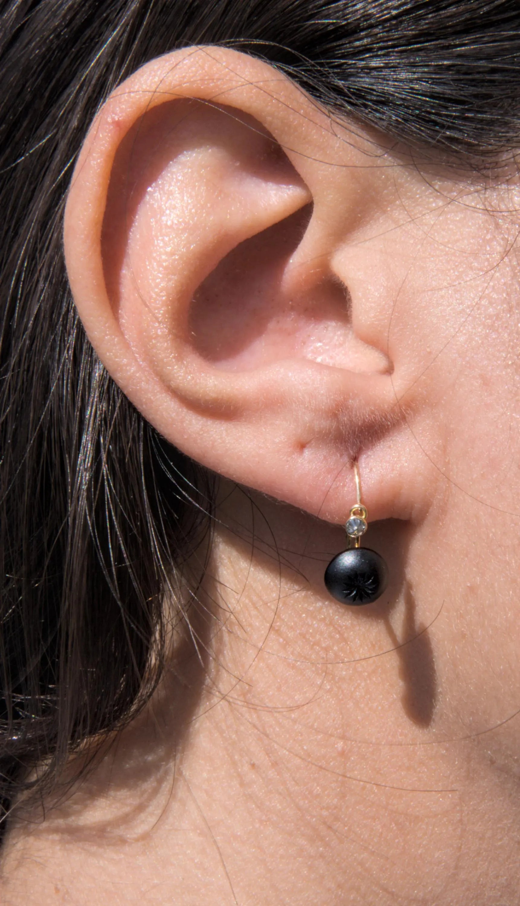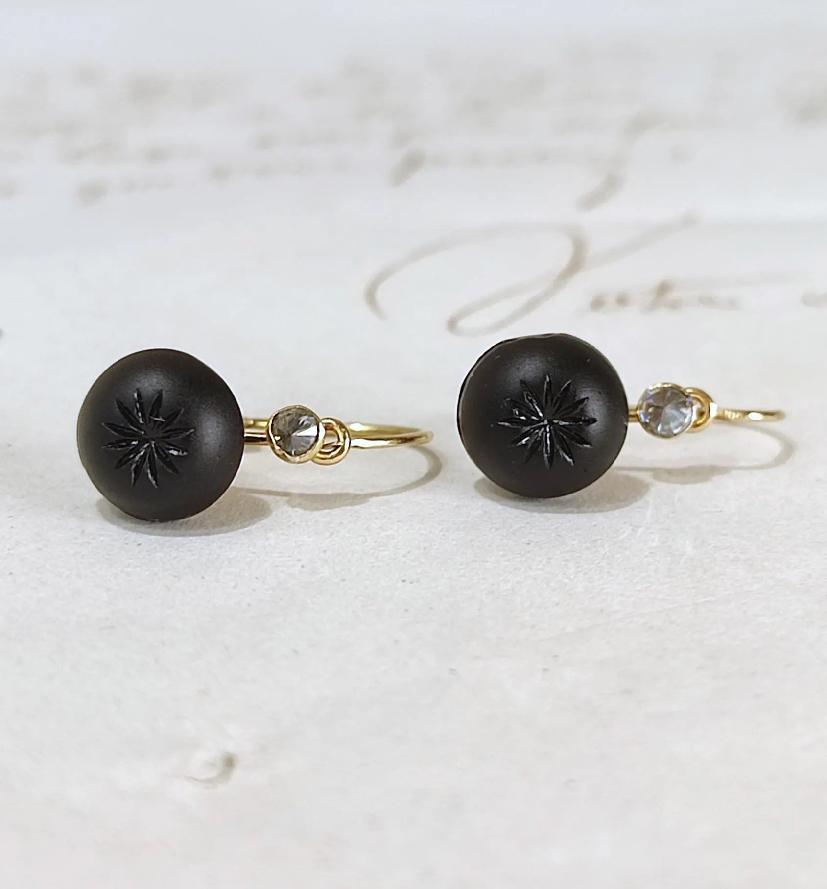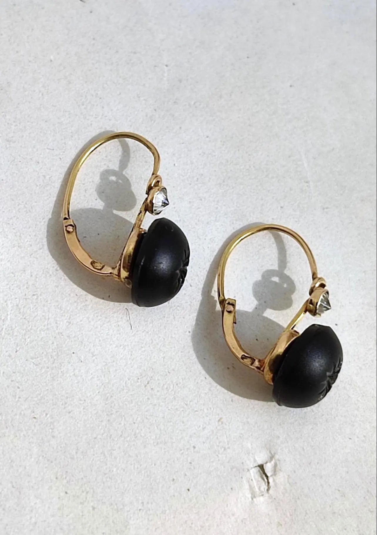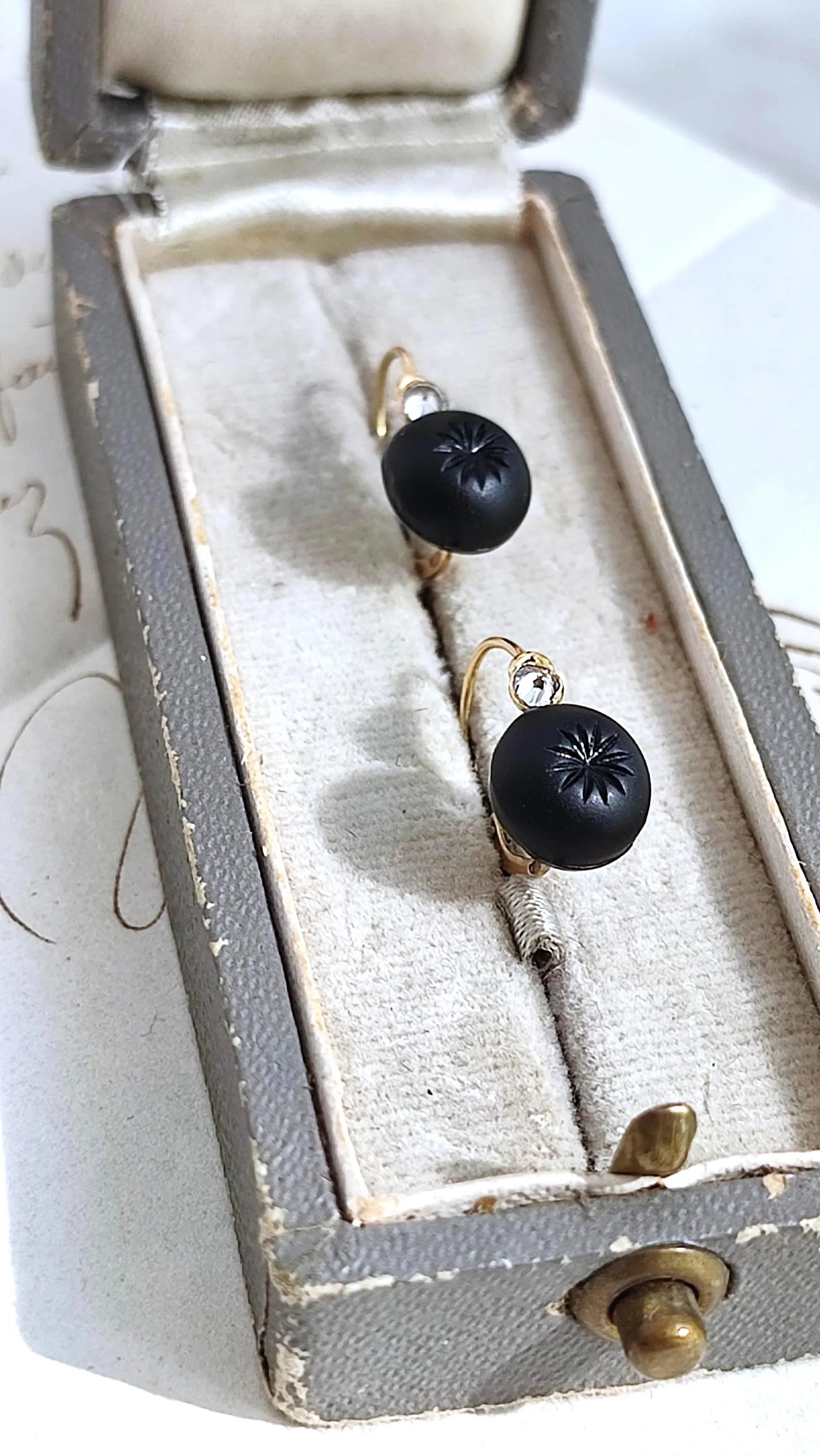 Ces dormeuses en or jaune 18k et cabochon de jais, rehaussées de diamants appartiennent à la tradition des bijoux de deuil et au style romantique noir de la fin du XIXᵉ siècle.