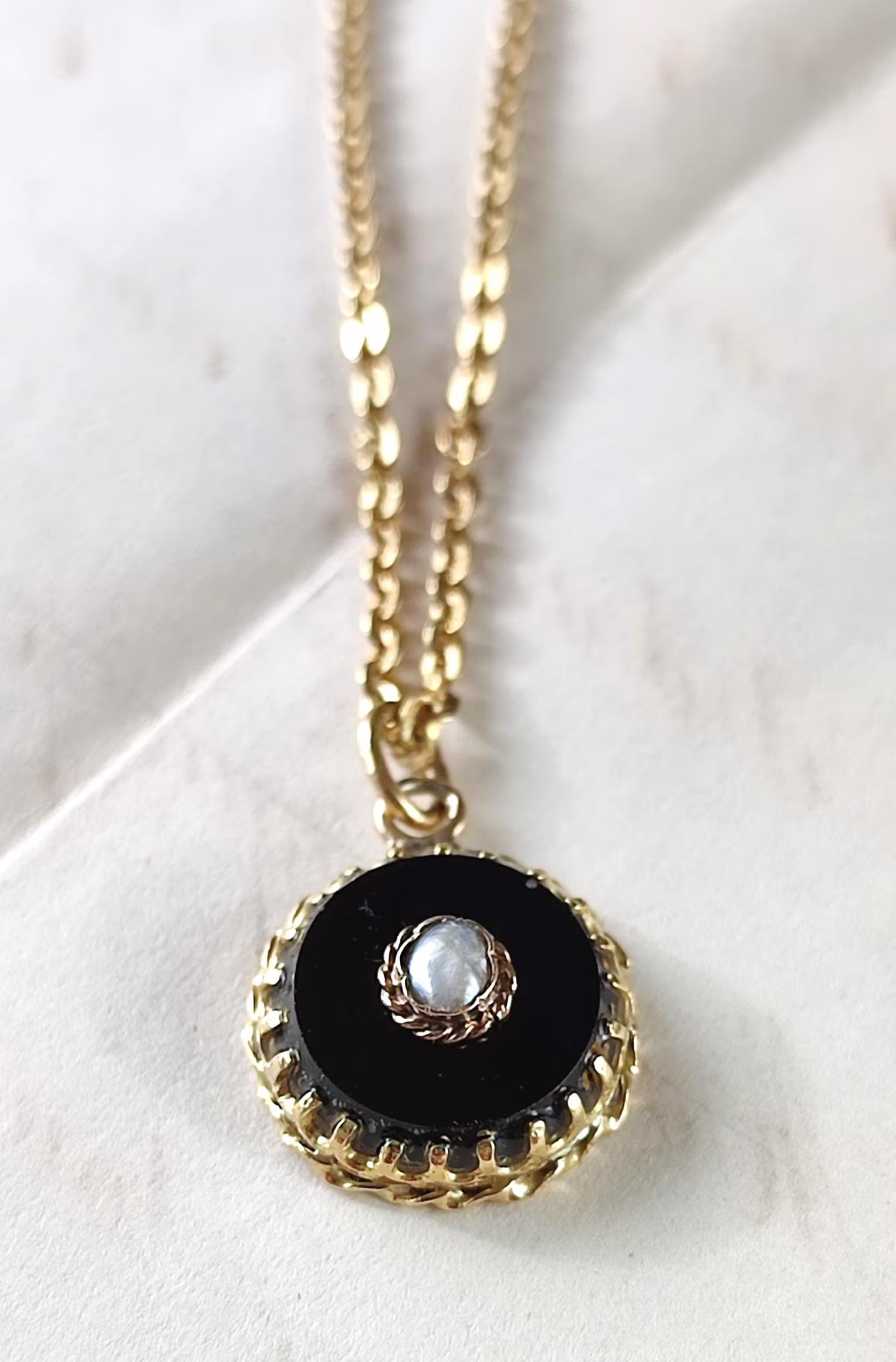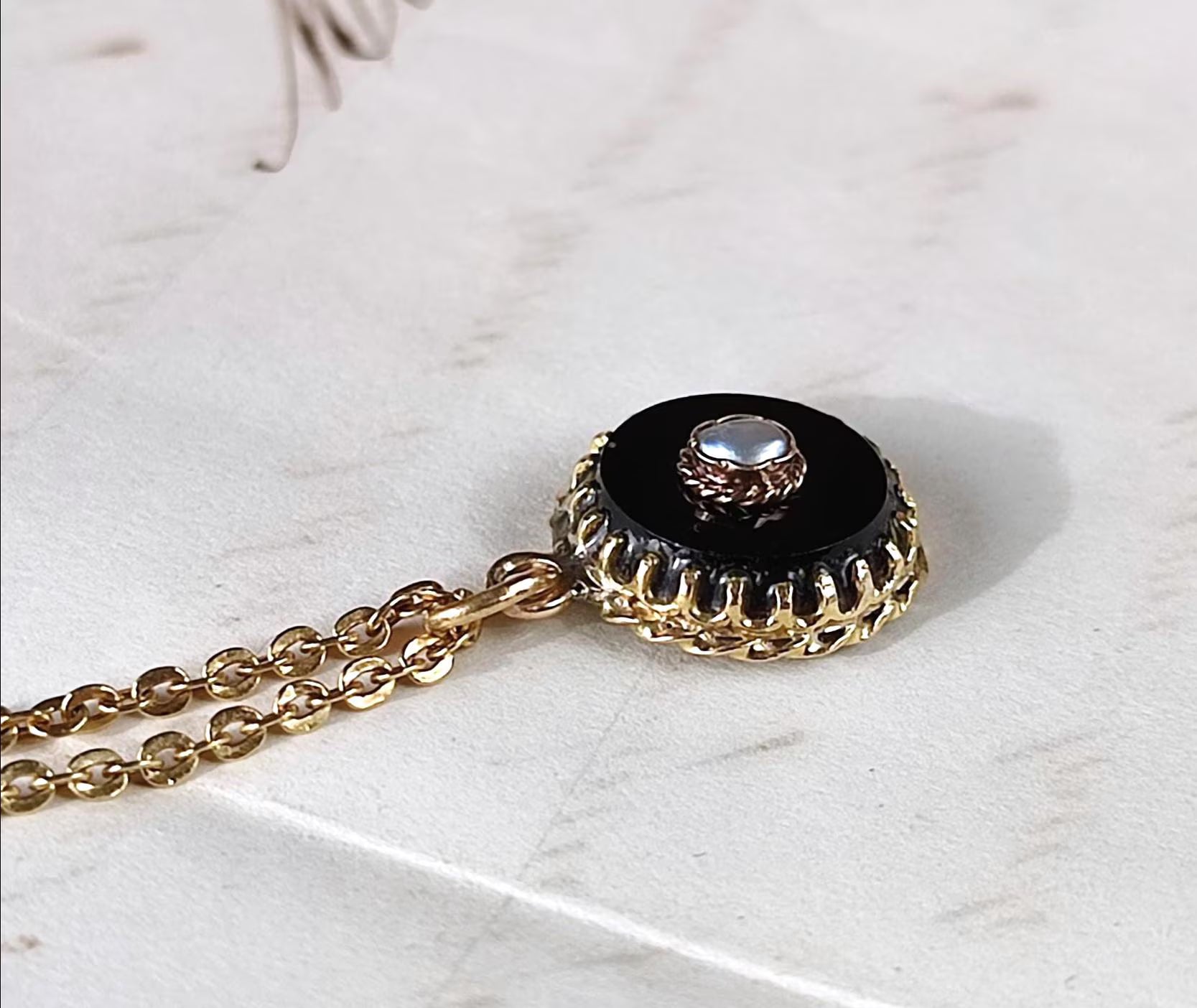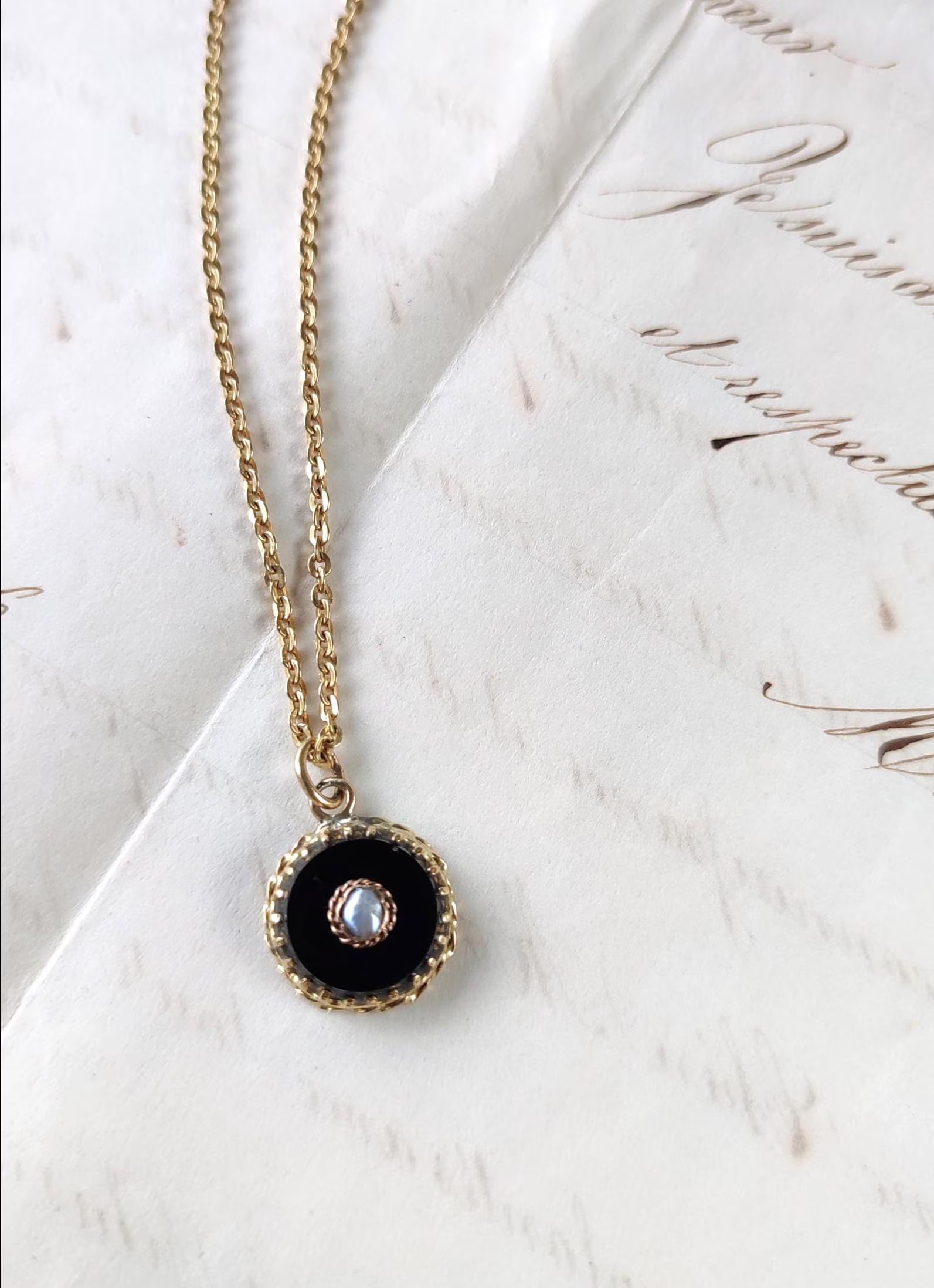 Pendentif ancien Napoléon III en or 18K, onyx noir et perle fine – ancienne épingle XIXe transformée